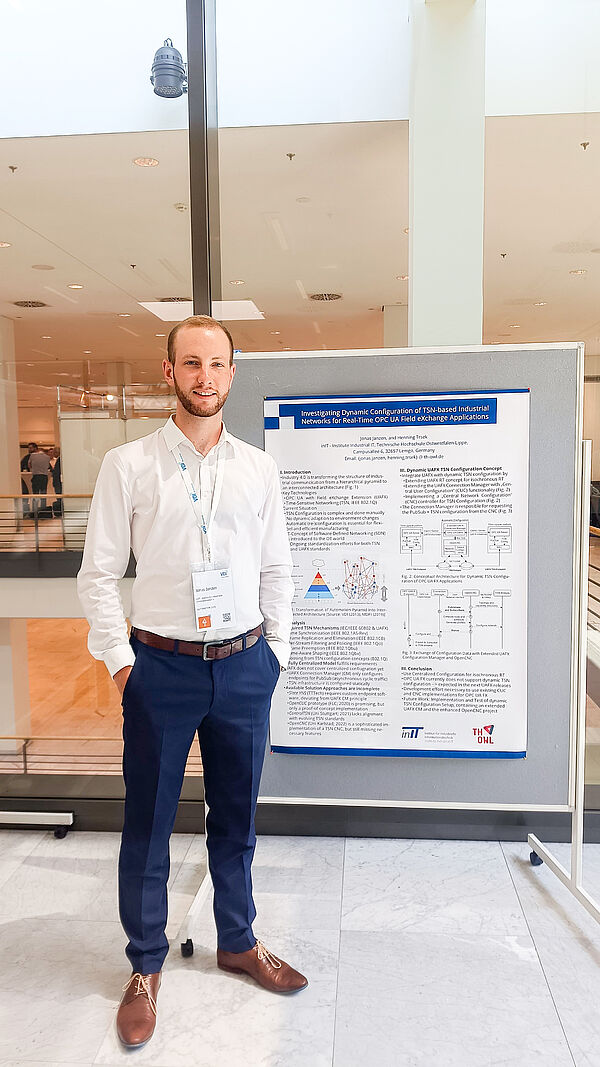 Jonas Janzen, wissenschaftlicher Mitarbeiter der von Prof. Dr. Henning Trsek geleiteten Forschungsgruppe Vernetzte Automatisierungssysteme, präsentierte auf dem Kongress ein Poster zum Thema „Investigating Dynamic Configuration of TSN-based Industrial Networks for Real-Time OPC UA Field eXchange Applications“.