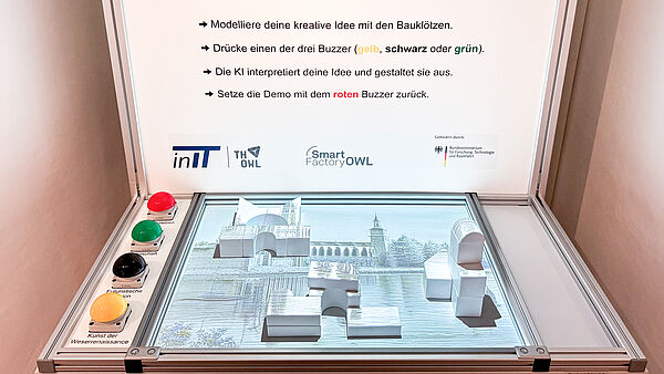 Der Demonstrator lädt Besucherinnen und Besucher dazu ein, selbst aktiv zu werden: Aus Bauklötzen entsteht eine Form, deren Höhenprofil von einer Tiefenkamera erfasst und in ein Graustufenbild umgewandelt wird. Dieses Graustufenbild wird zusammen mit einem Prompt an ein Diffusionsmodell übergeben, das daraus ein Farbbild generiert. So entstehen je nach Eingabe sehr unterschiedliche Motive.